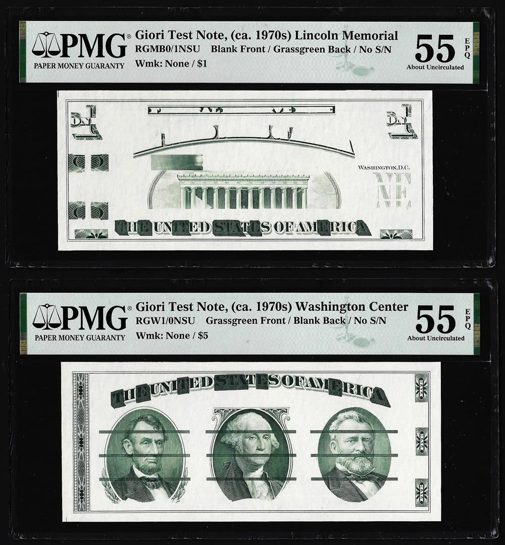 One Set of Giori Test Note Washington & Lincoln Memorial PMG About Uncirculated 55EPQ. PMG Certified.