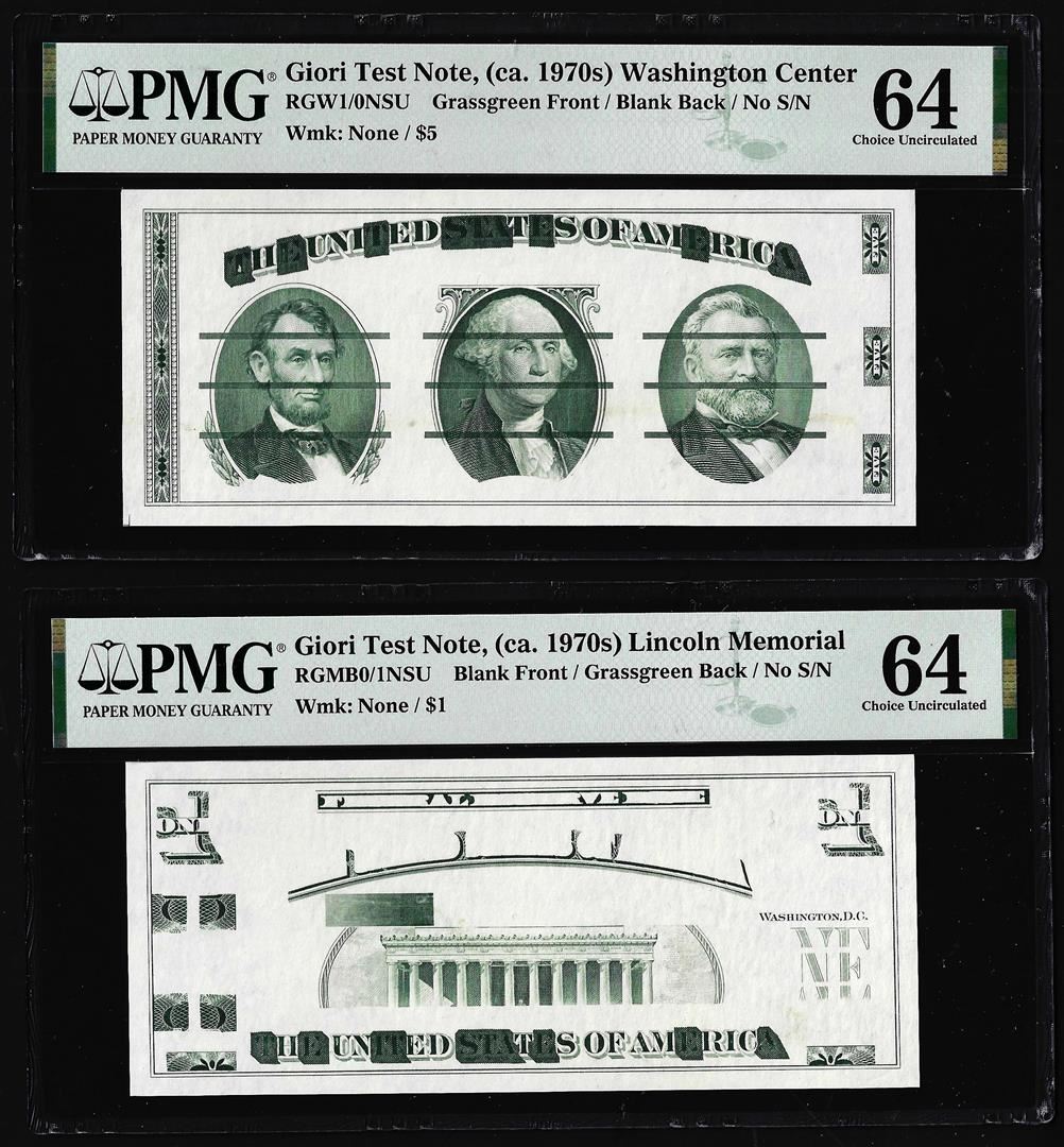 One Set of Giori Test Note Washington & Lincoln Memorial PMG Choice Uncirculated 64. PMG Certified.
