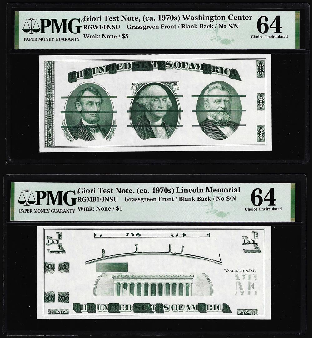 One Set of Giori Test Note Washington & Lincoln Memorial PMG Choice Uncirculated 64. PMG Certified.