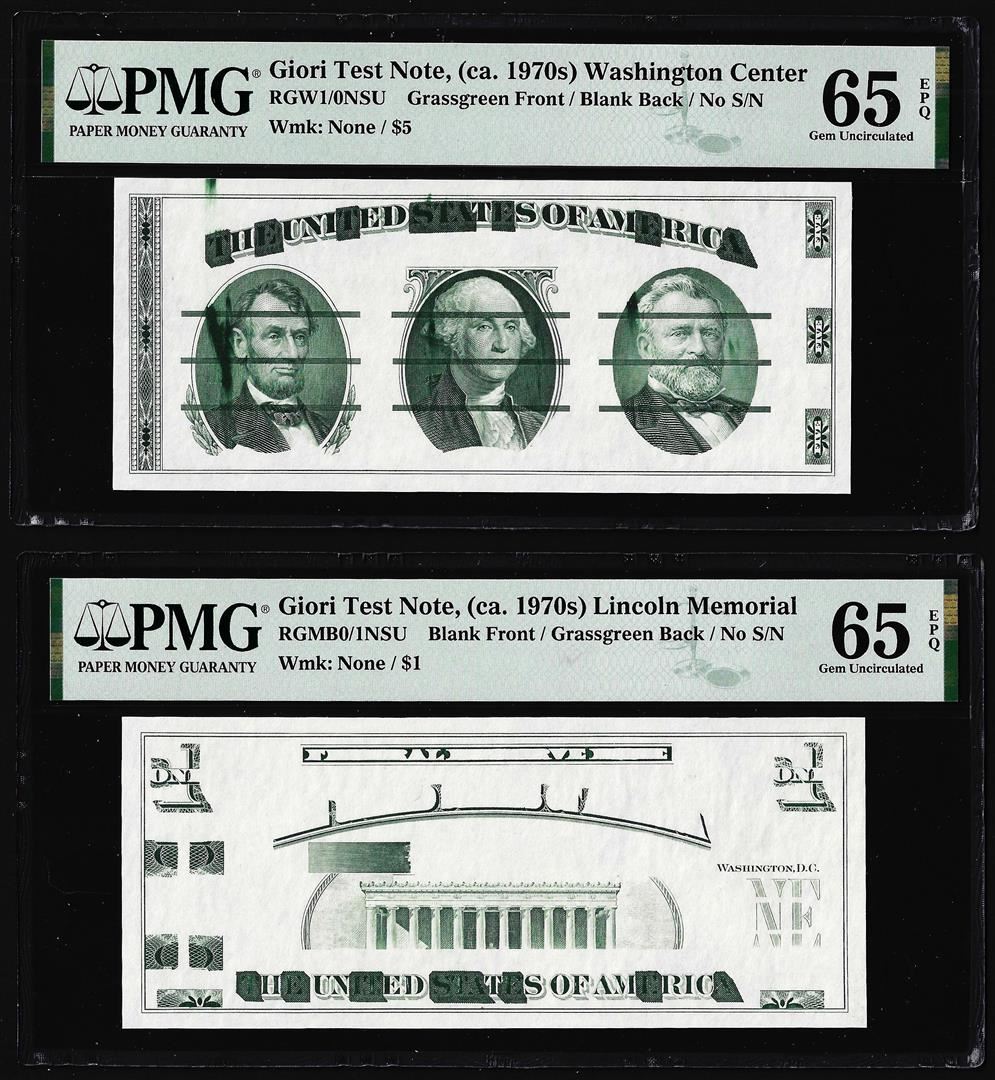 One Set of Giori Test Note Washington & Lincoln Memorial PMG Gem Uncirculated 65EPQ. PMG Certified.