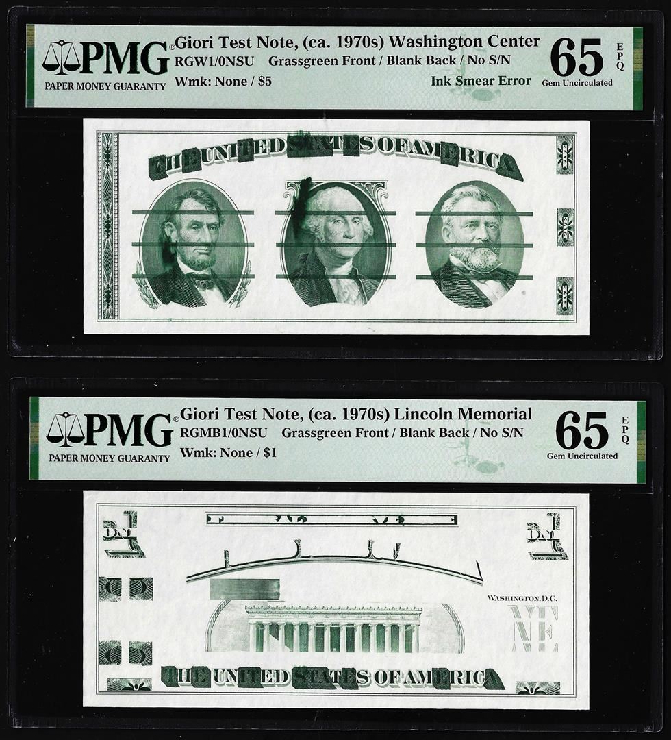One Set of Giori Test Note Washington & Lincoln Memorial PMG Gem Uncirculated 65EPQ. PMG Certified.