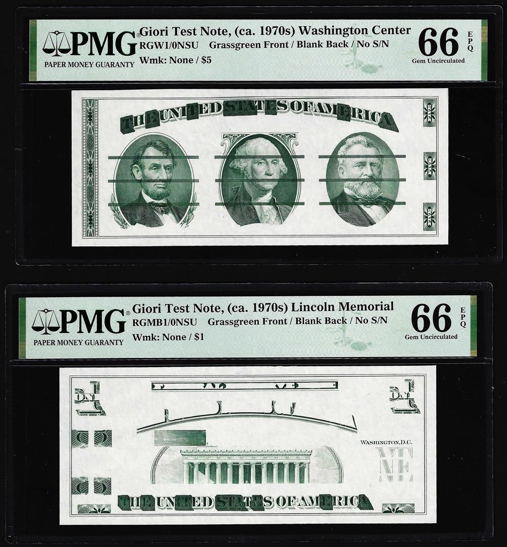 One Set of Giori Test Note Washington & Lincoln Memorial PMG Gem Uncirculated 66EPQ. PMG Certified.