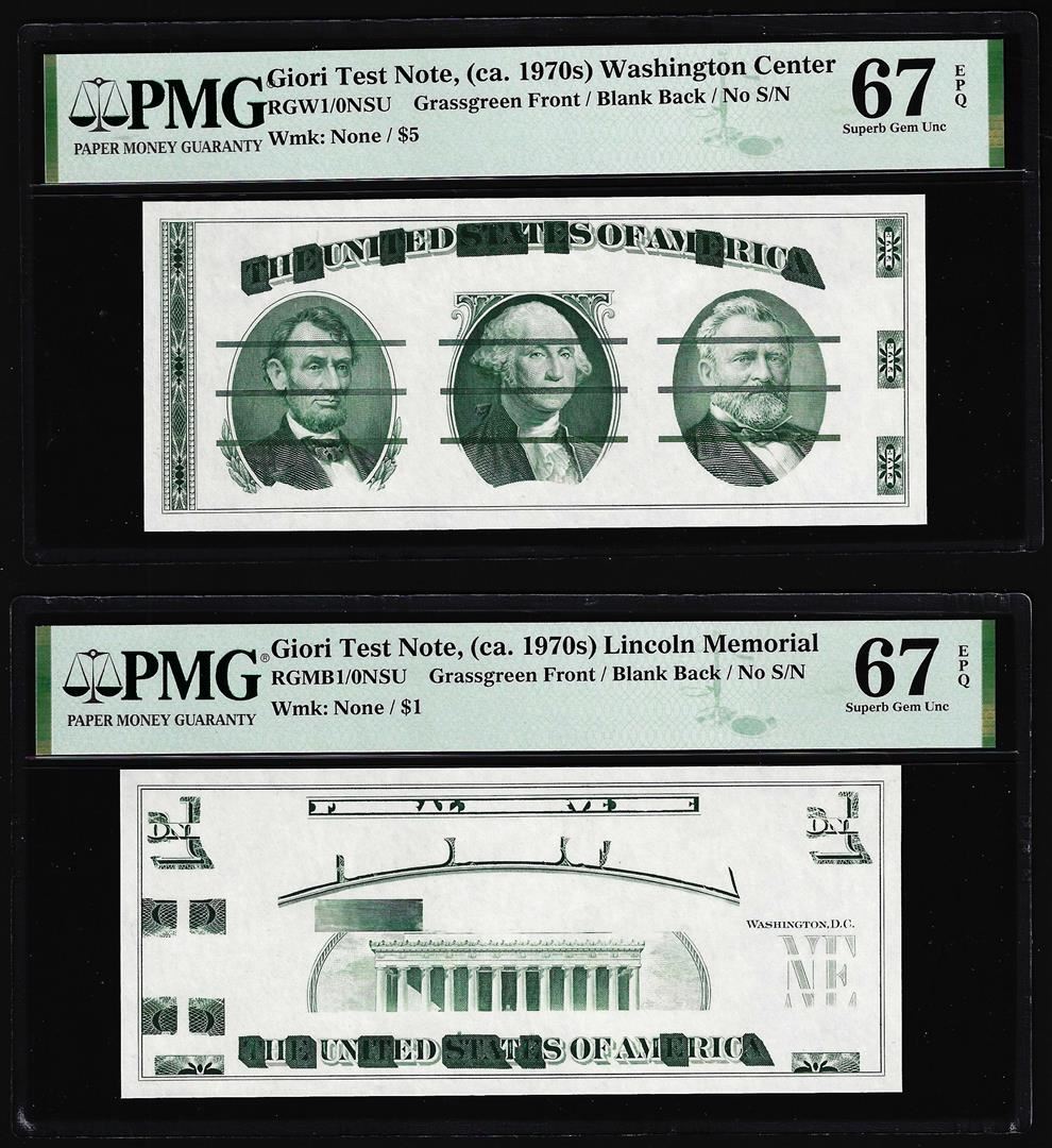 One Set of Giori Test Note Washington & Lincoln Memorial PMG Superb Gem Unc 67EPQ. PMG Certified.