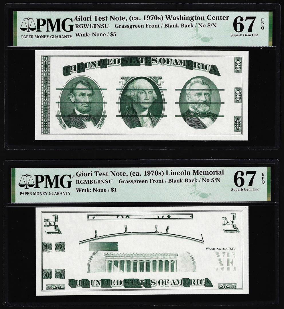 Set of Giori Test Note Washington & Lincoln Memorial PMG Superb Gem Unc 67EPQ