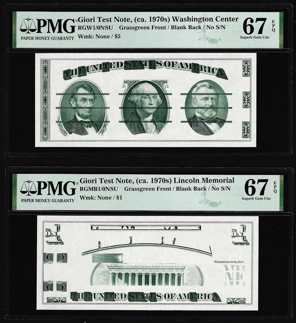 One Set of Giori Test Note Washington & Lincoln Memorial PMG Superb Gem Unc 67EPQ. PMG Certified.