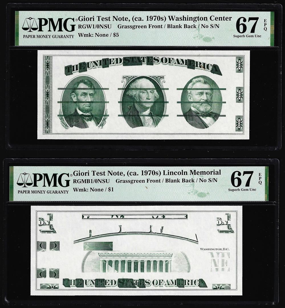 Set of Giori Test Note Washington & Lincoln Memorial PMG Superb Gem Unc 67EPQ