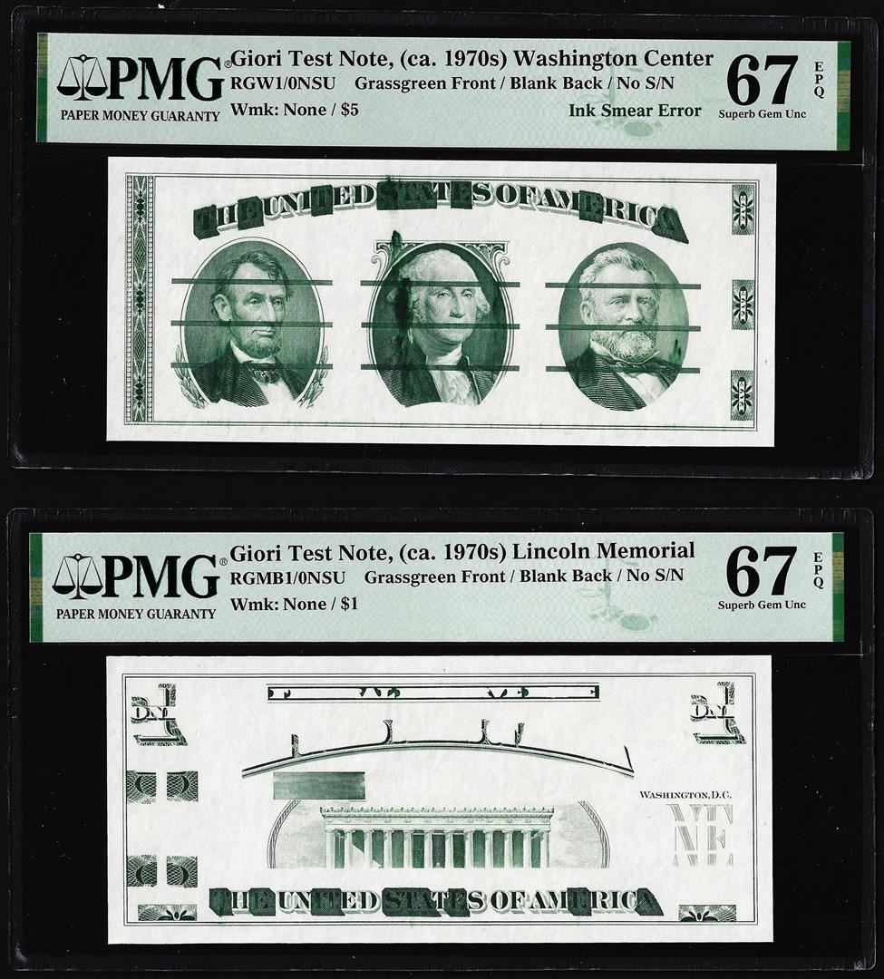 One Set of Giori Test Note Washington & Lincoln Memorial PMG Superb Gem Unc 67EPQ. PMG Certified.