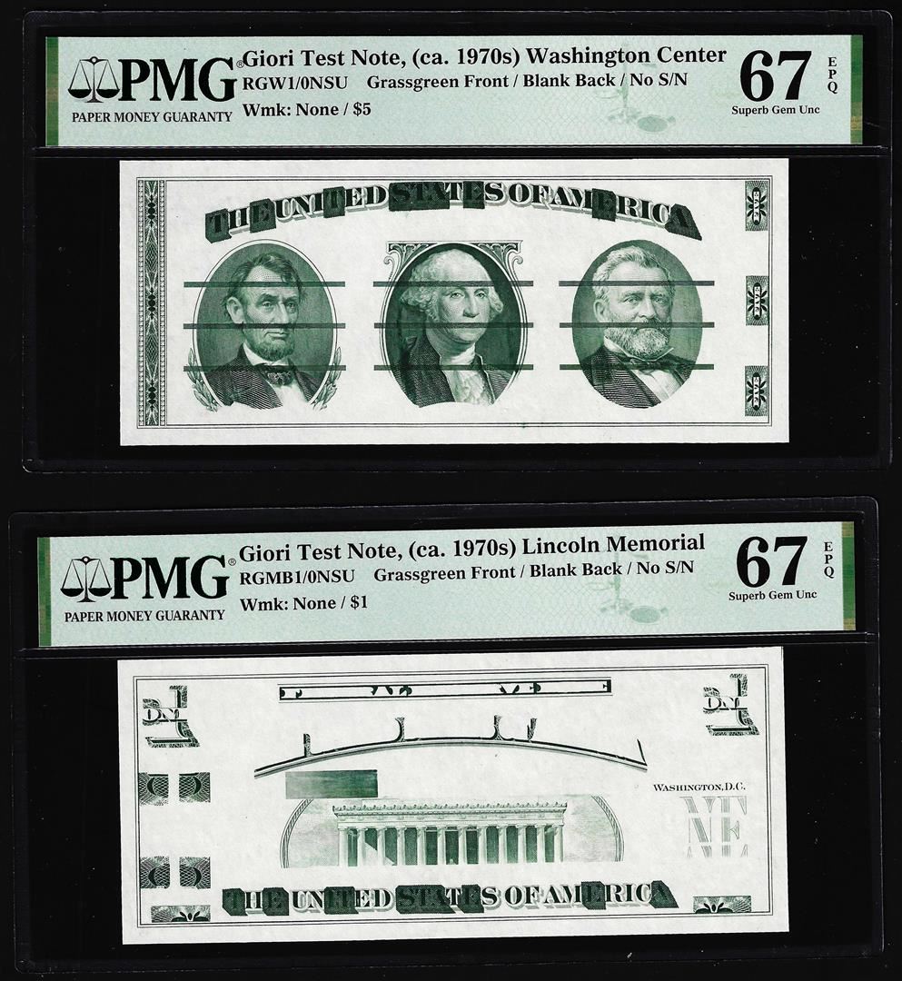 Set of Giori Test Note Washington & Lincoln Memorial PMG Superb Gem Unc 67EPQ
