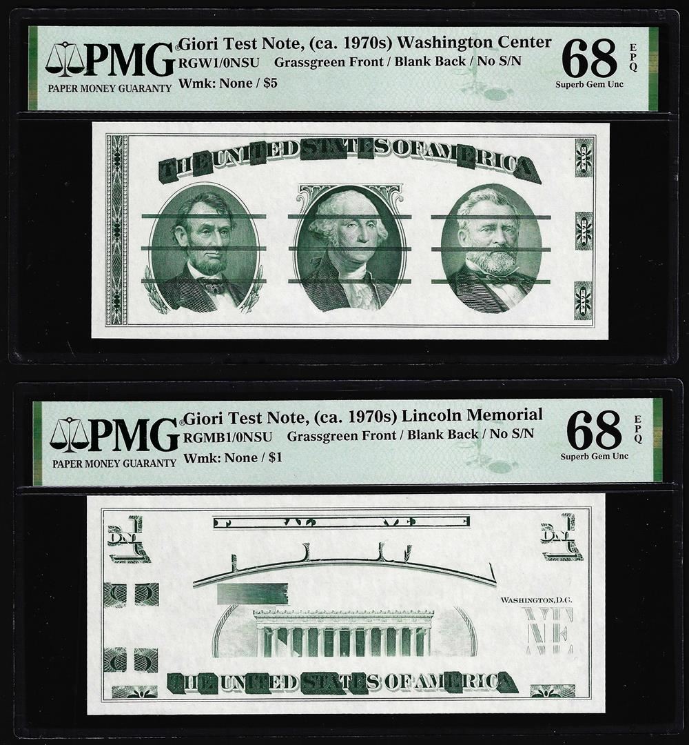 One Set of Giori Test Note Washington & Lincoln Memorial PMG Superb Gem Unc 68EPQ. PMG Certified.
