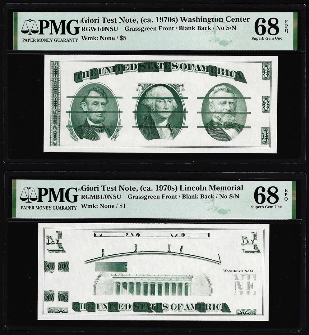 One Set of Giori Test Note Washington & Lincoln Memorial PMG Superb Gem Unc 68EPQ. PMG Certified.