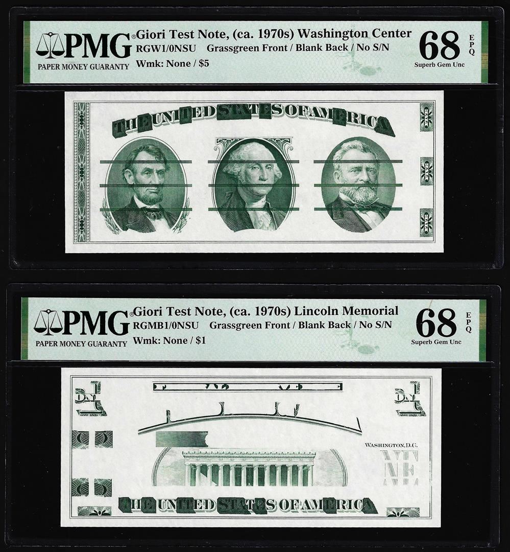 One Set of Giori Test Note Washington & Lincoln Memorial PMG Superb Gem Unc 68EPQ. PMG Certified.