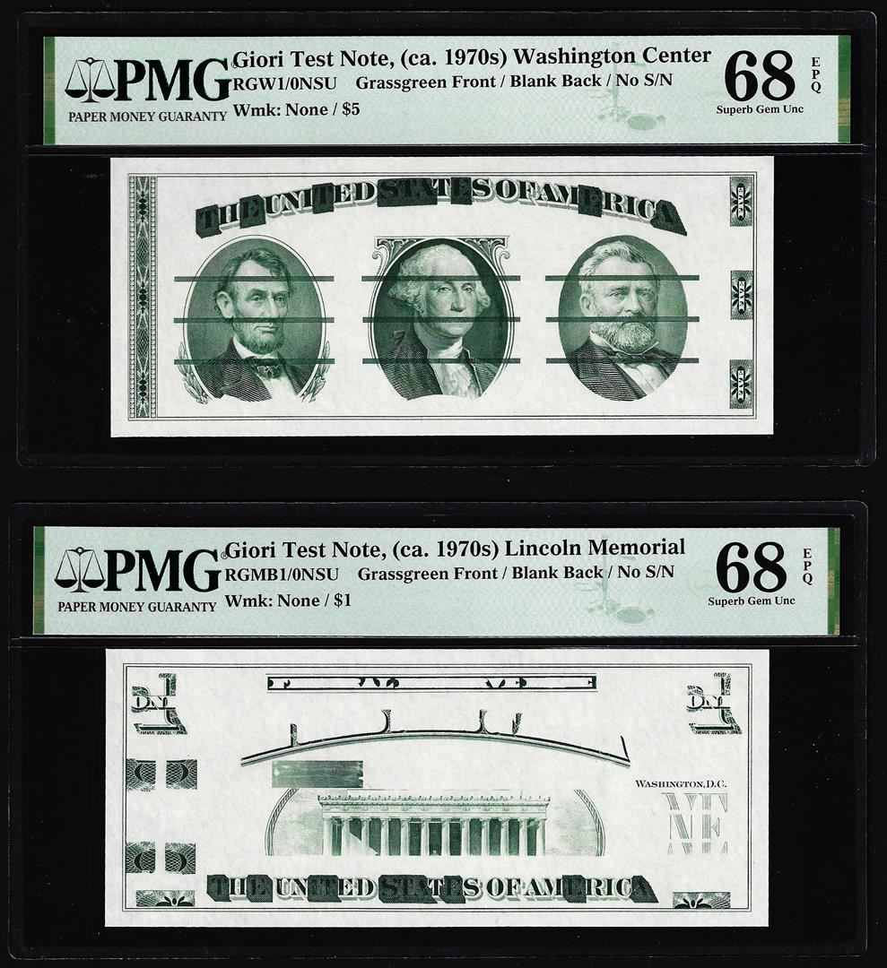 One Set of Giori Test Note Washington & Lincoln Memorial PMG Superb Gem Unc 68EPQ. PMG Certified.