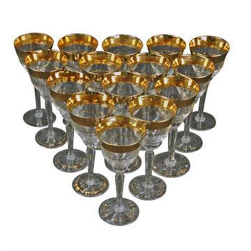 A set of 15 crystal wine goblets with gold overlay decoration. 6.75" tall with 2.75 diameter base. Total weight of set is 4.1 lbs. There is a chip on the rim of one glass.