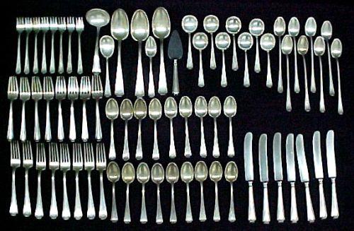Set of Gorham sterling silver flatware; seventy-two pieces; monogrammed P; including eight dinner forks 7 1/4"; eight salad forks 6 1/4"; eight oyster forks 5 5/8"; seven dinner knives 8 5/8"; eighteen teaspoons; eight cream soup spoons; eight iced tea sp