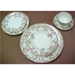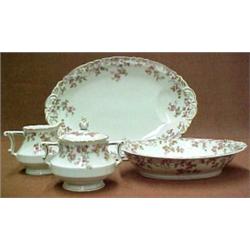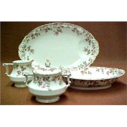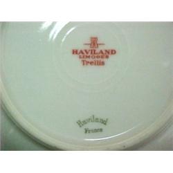 Set of Haviland Limoges dinnerware "Trellis", eighty pieces including oval platter with gravy well 13 1/2", oval serving bowl 10", twelve 10 1/2" plates (one with damage), twelve 7 3/4" plates (one with rim chip), twelve 8" soup plates, twelve 6 1/2" plates, thirteen saucers, twelve teacups (one with chip on base), creamer, covered sugar, and a non-matching gravy boat with attached undertray marked Johann Haviland Bavaria "Chippendale" Estimate 500/900