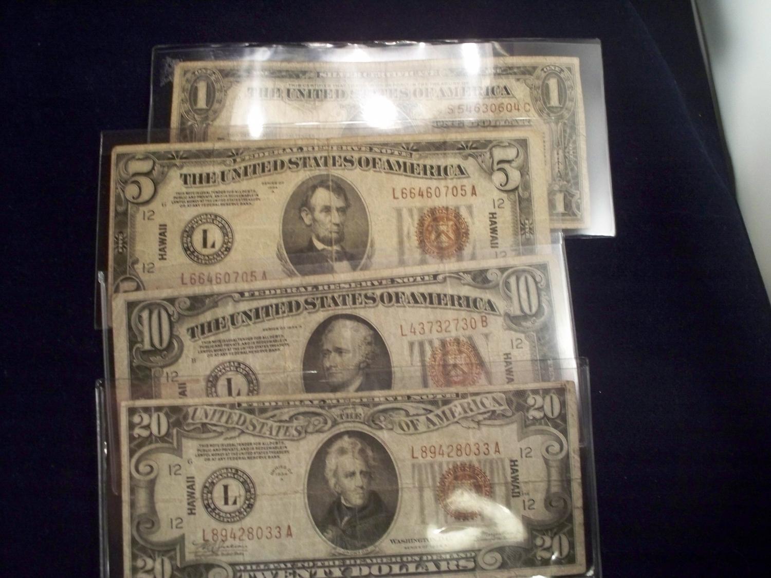 Set of Hawaii WWII Bank Notes, $1, $5, $10, $20