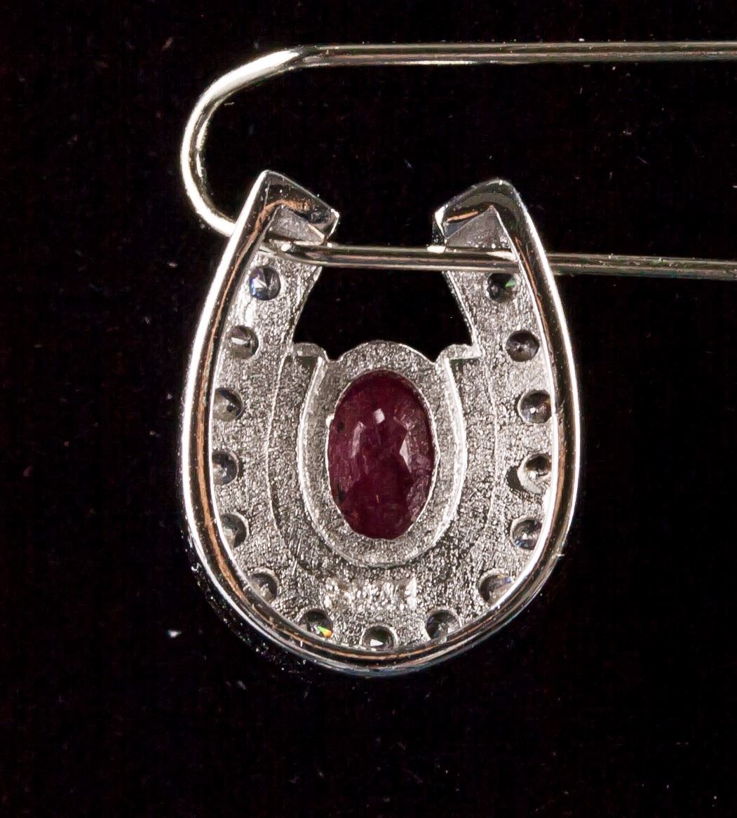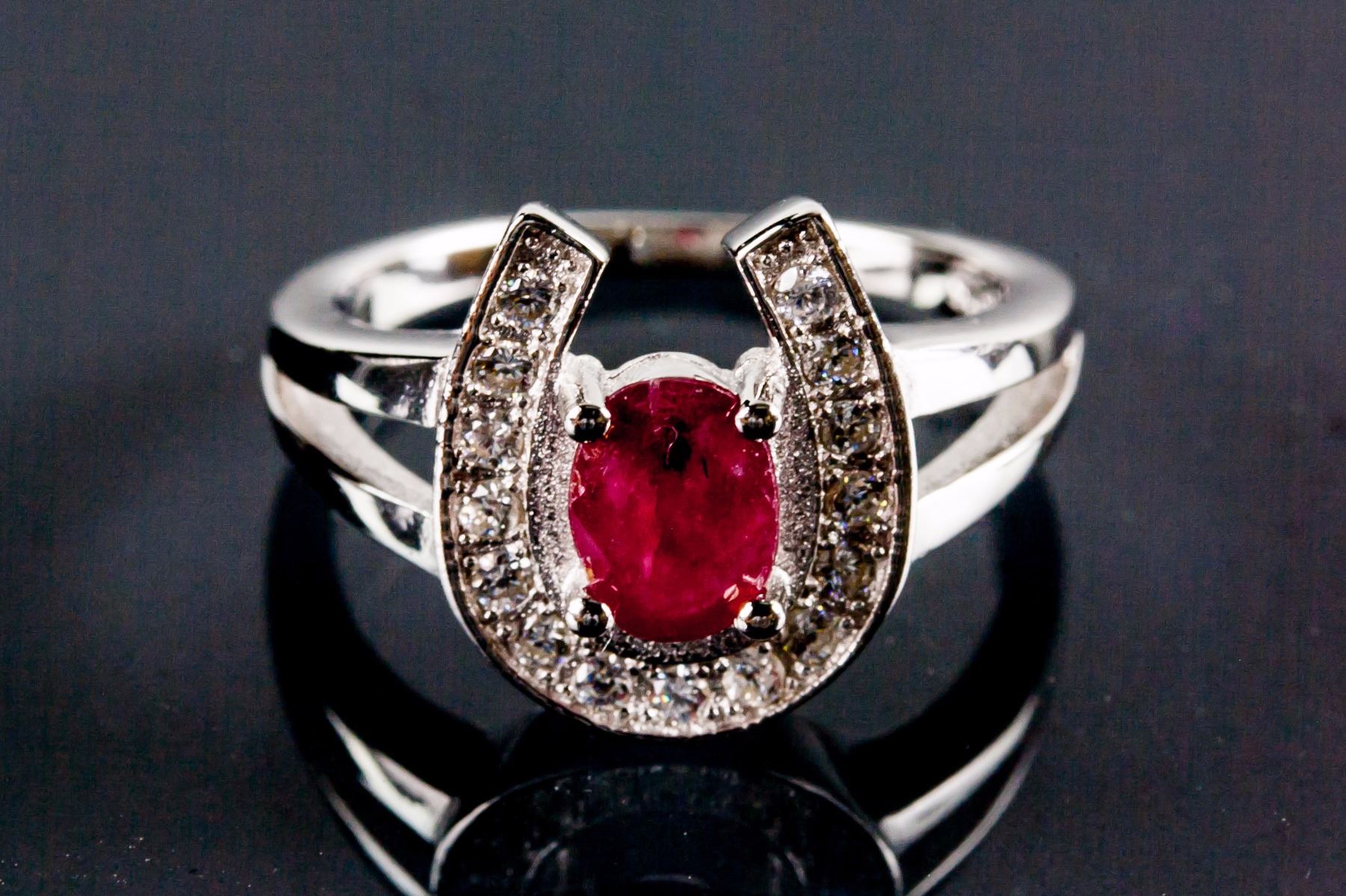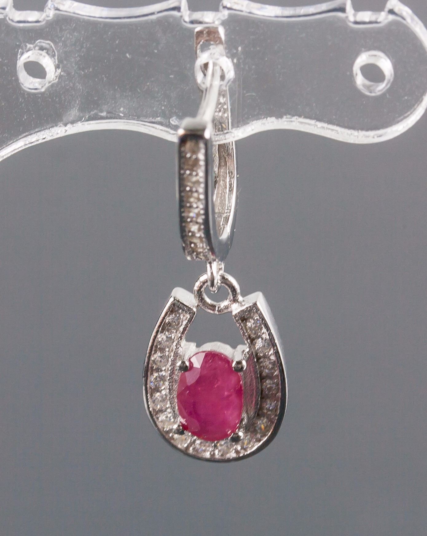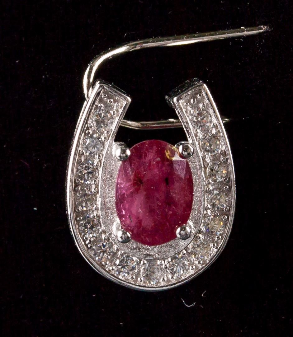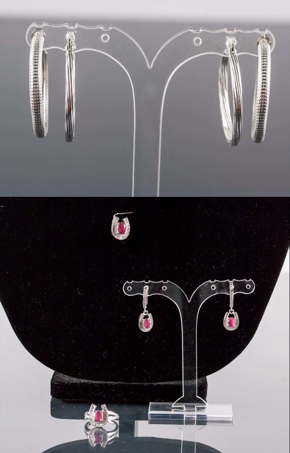 Two pairs of large sterling silver hoop earrings; retail value $170; Sterling silver horseshoe halo ring, earring and pendant; set with rubies; retail value $600
