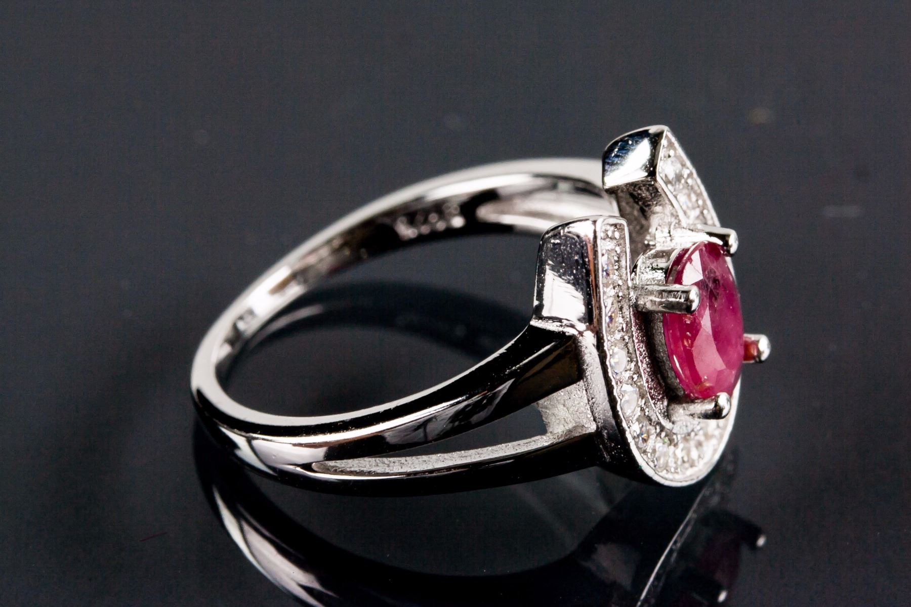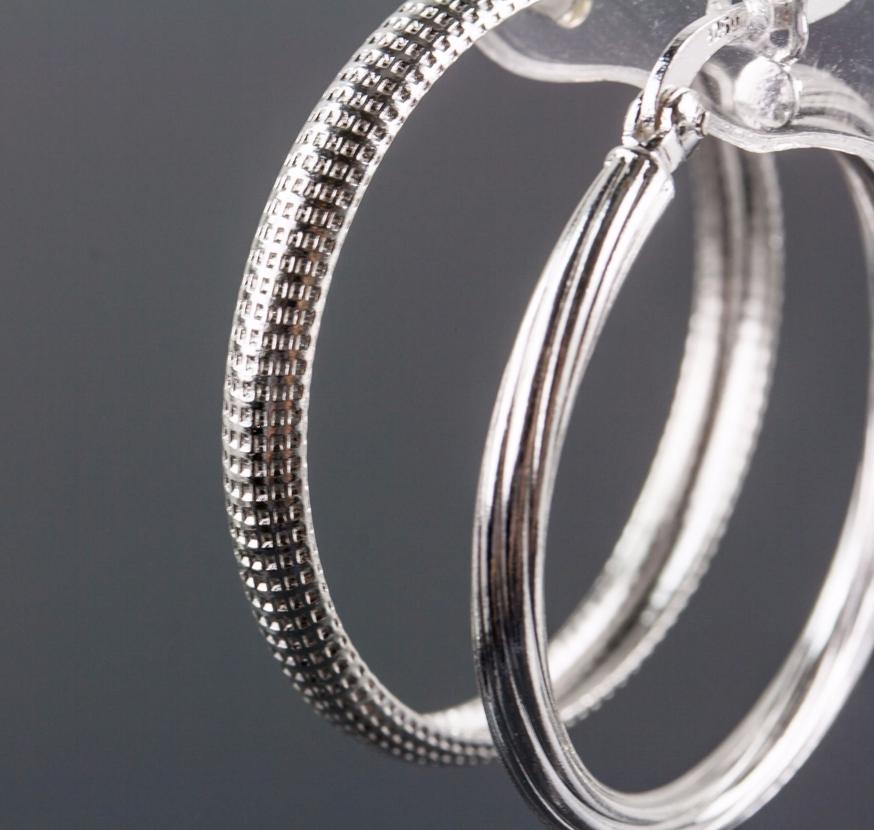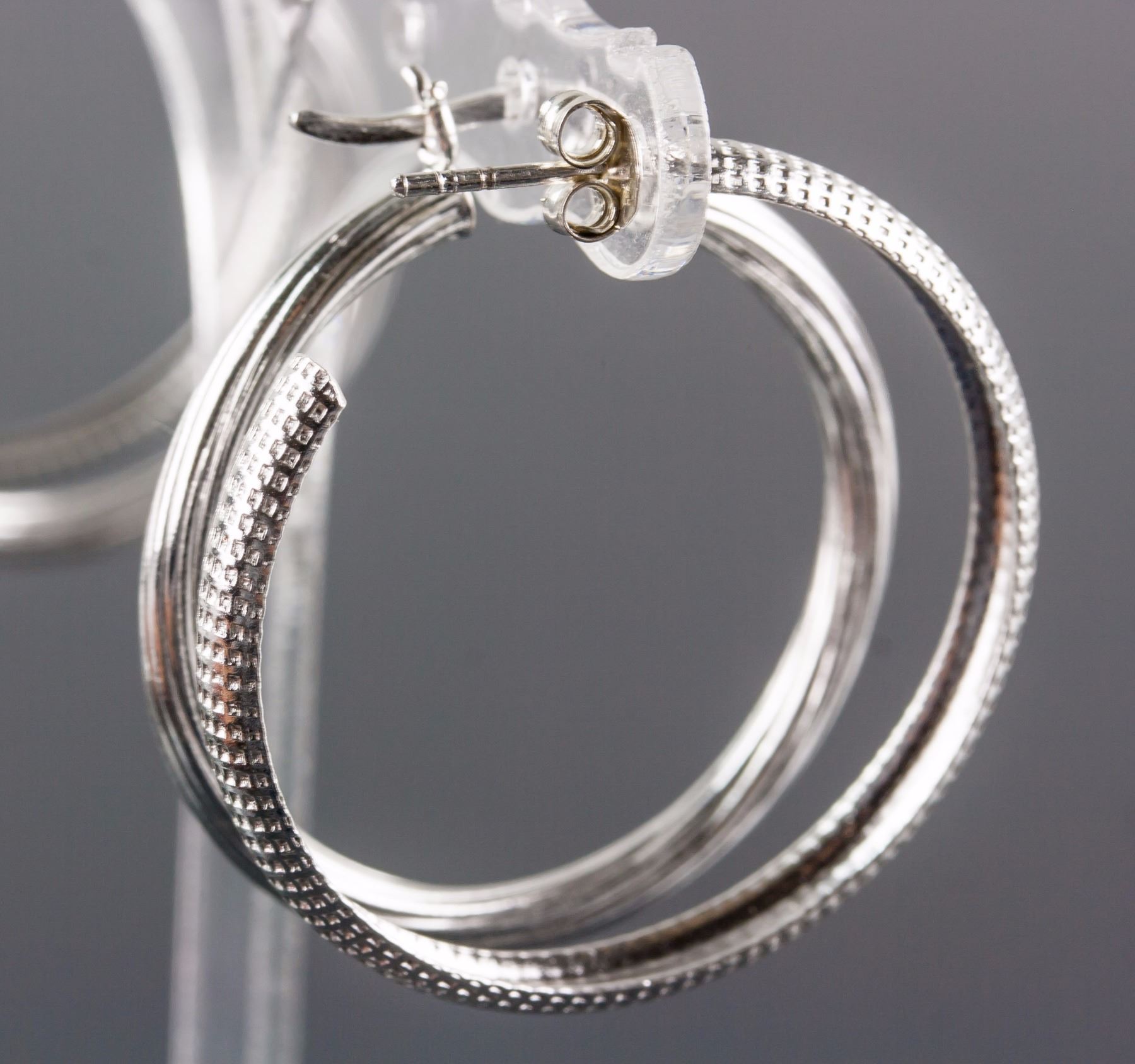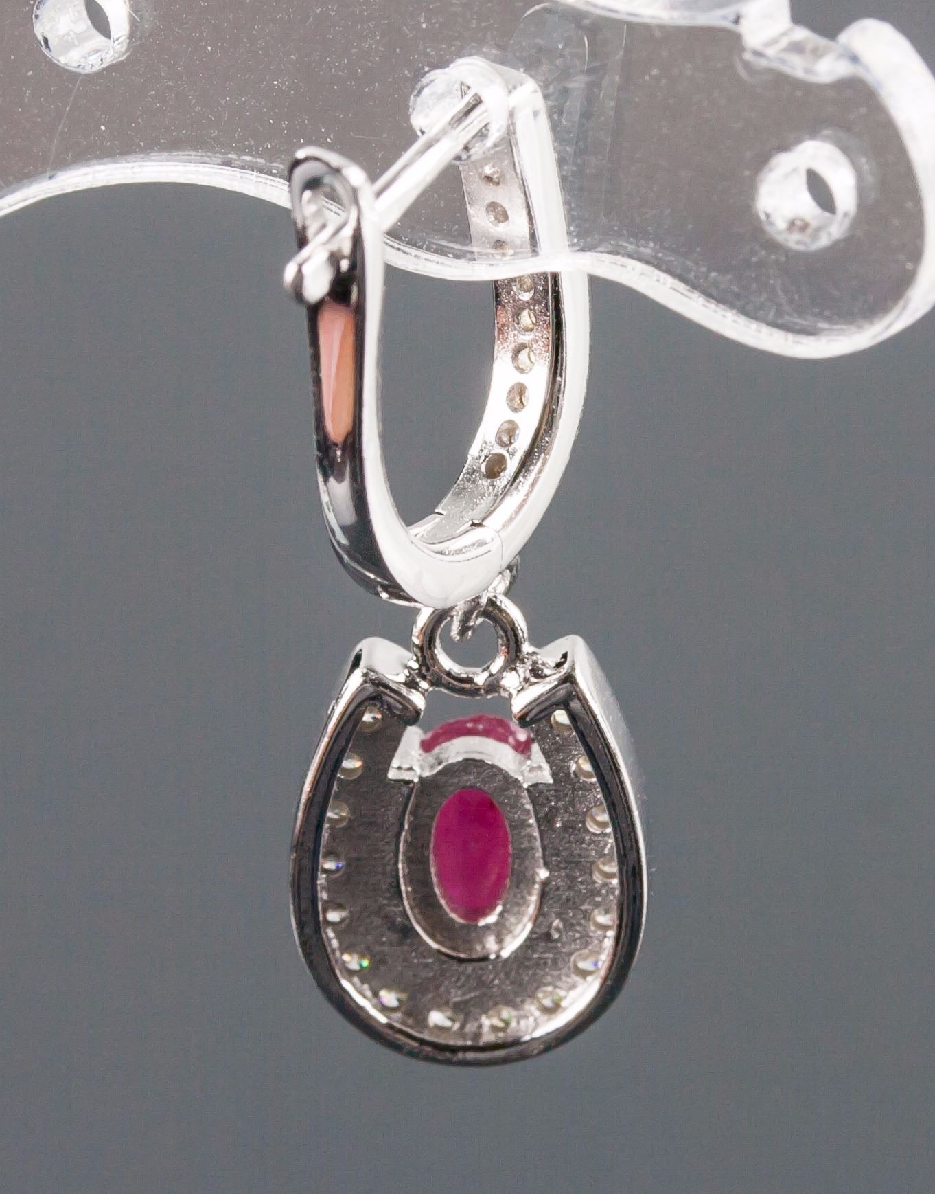 Two pairs of large sterling silver hoop earrings; retail value $170; Sterling silver horseshoe halo ring, earring and pendant; set with rubies; retail value $600