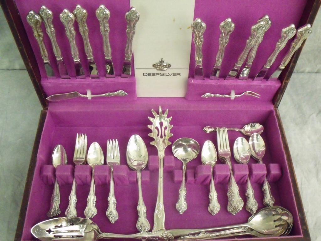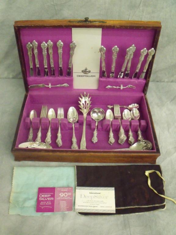 63 pieces of International Deep Silver Set, contains butter knives, tea spoons, place forks, salad forks, place knives, place spoons, serving pieces, and tarnish resistant chest, al in good condition.