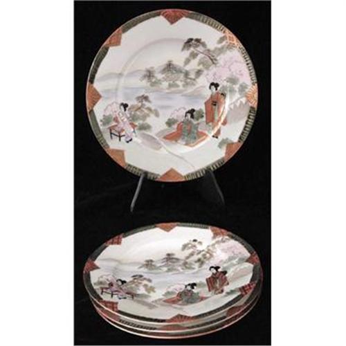 Set of four porcelain plates depicting geishas in a garden. Marked on the back with an oriental character in gold over a red background. Country and date of manufacture unknown, most likely Japanese but China is known to make Japanese-themed items as well. All plates in good condition. Please ask questions, request additional photos and shipping costs before buying.
