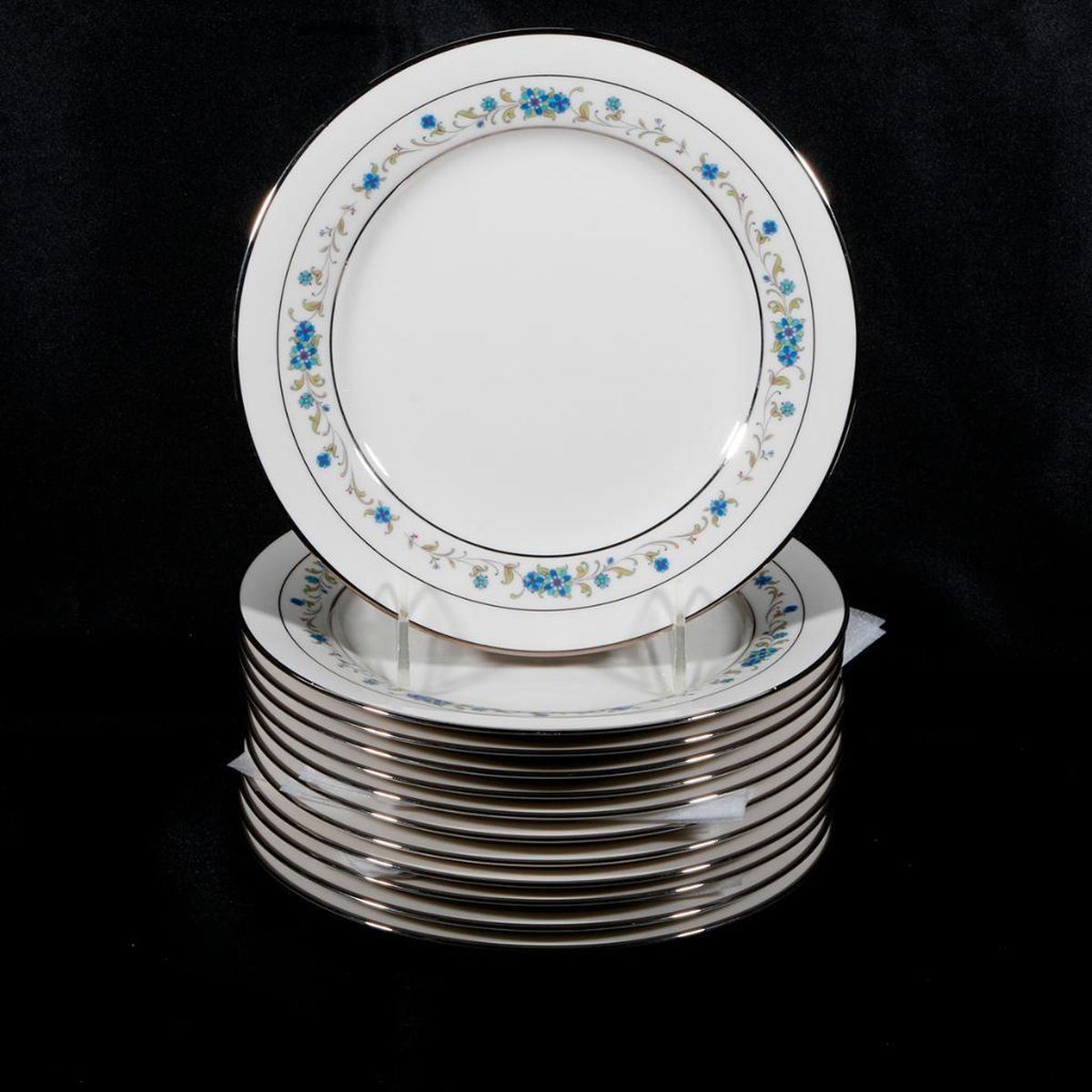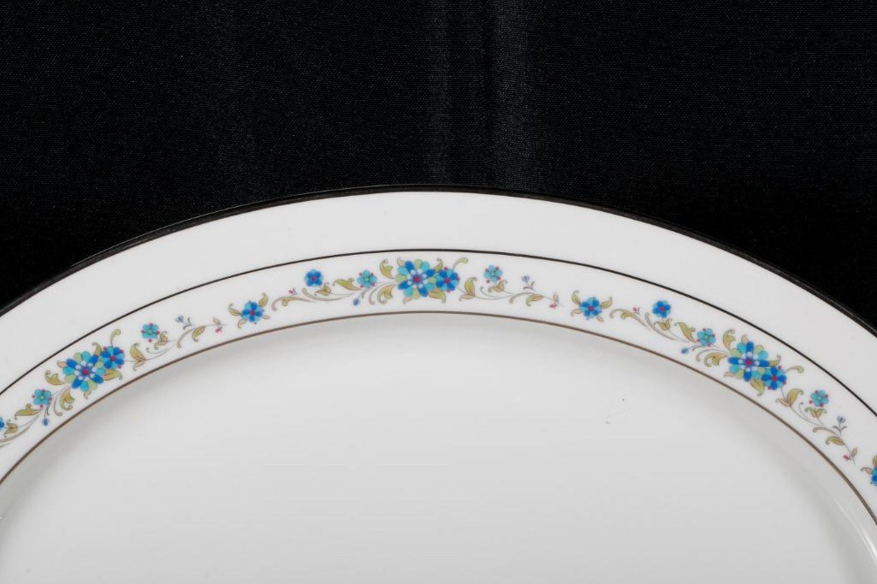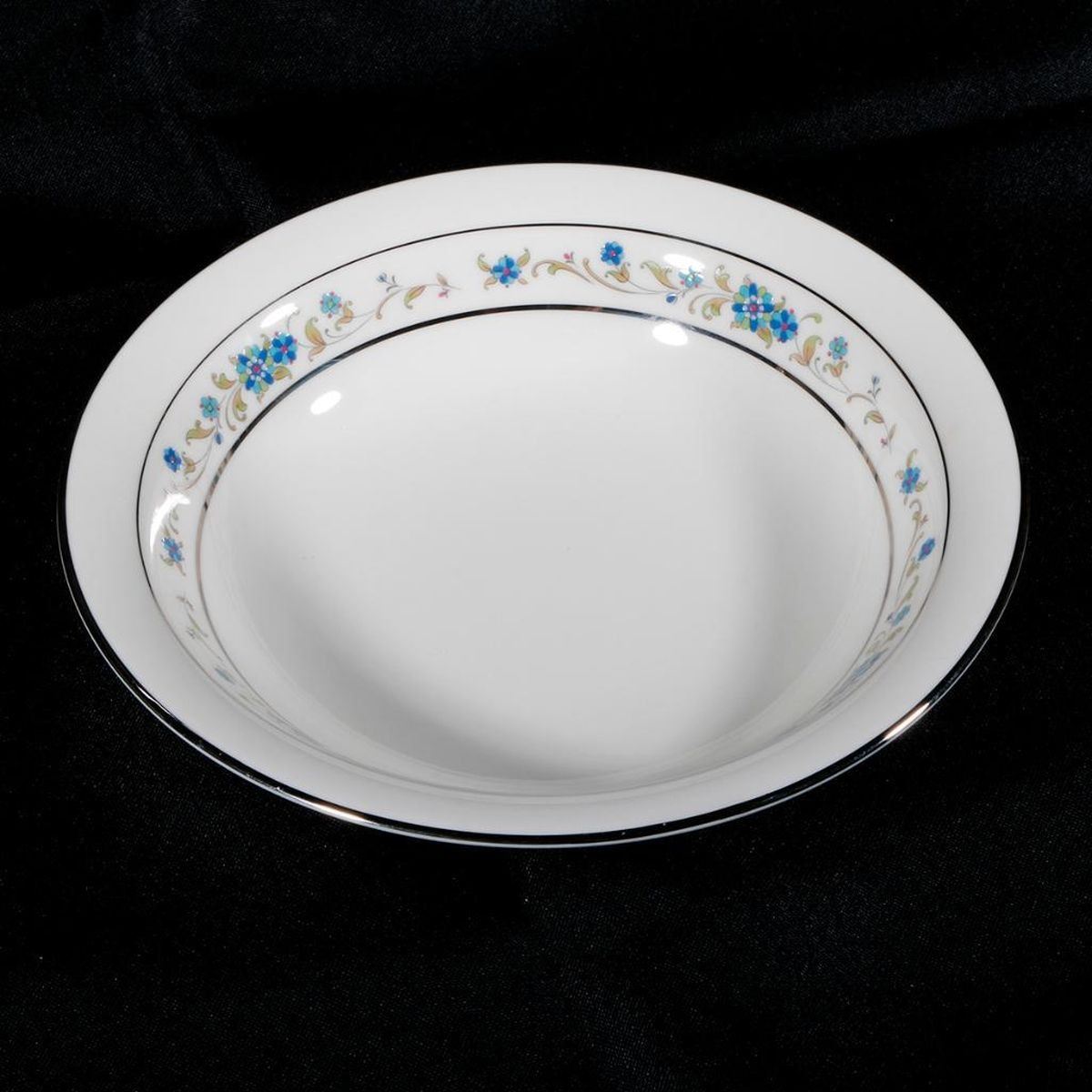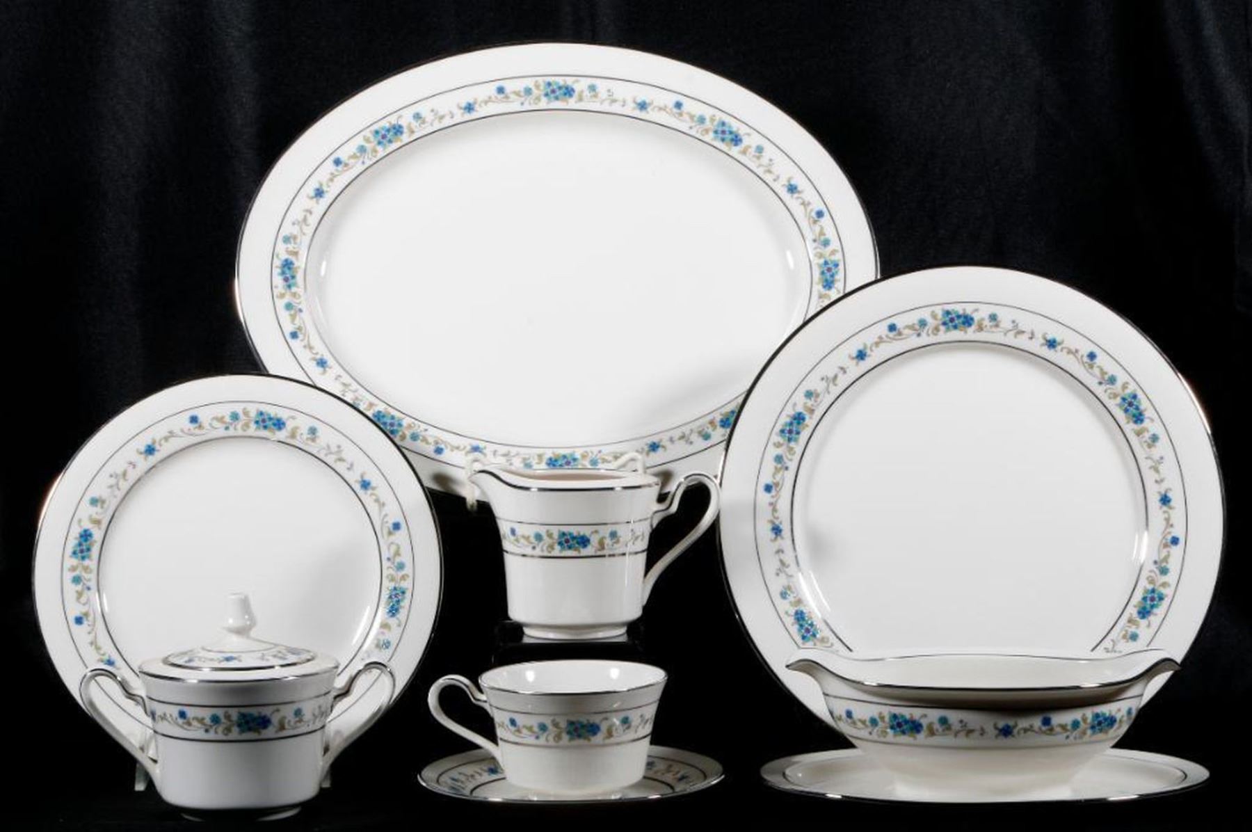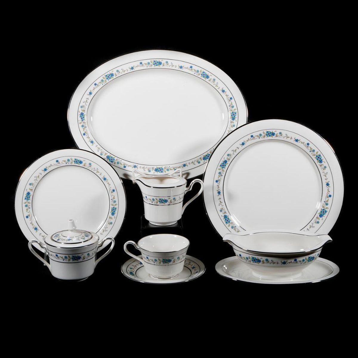 A 93 piece Mid century Japanese Noritake porcelain dinner set consisting of 12 dinner plates 12 salad plates, 12 teacups, 12 saucers, 12 finger bowls, 12 soup bowls, 12 base plates, 5 serving pieces, a creamer and sugar and a salt and pepper.