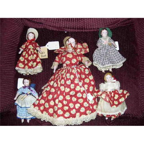 Set of Little Women by Ruth Gibbs Complete. I have put this in pre 1930's as I don't see a category for the later china dolls. These were made in the 1940's and 50's. This set includes 5 dolls. Mrs. March the 12" doll and the 4 7" Litle Woman. Amy has the same print as Mrs. March but has a white bodice. Amy has a tag in her skirt. Jo has the booklet that says Jo's book but no tag in the skirt. Beth is in blue and has her music as well as a tag in the skirt. Meg is in brown check with flowers, no tag. Mrs. March doesn't have a tag in her skirt. The bonnet on Mrs. March is soiled. They are a nice set and to get them all together is great. Dolls come from a smoke free environment. Buyer to pay $30 for shipping, handling, and insurance. Thanks for viewing.