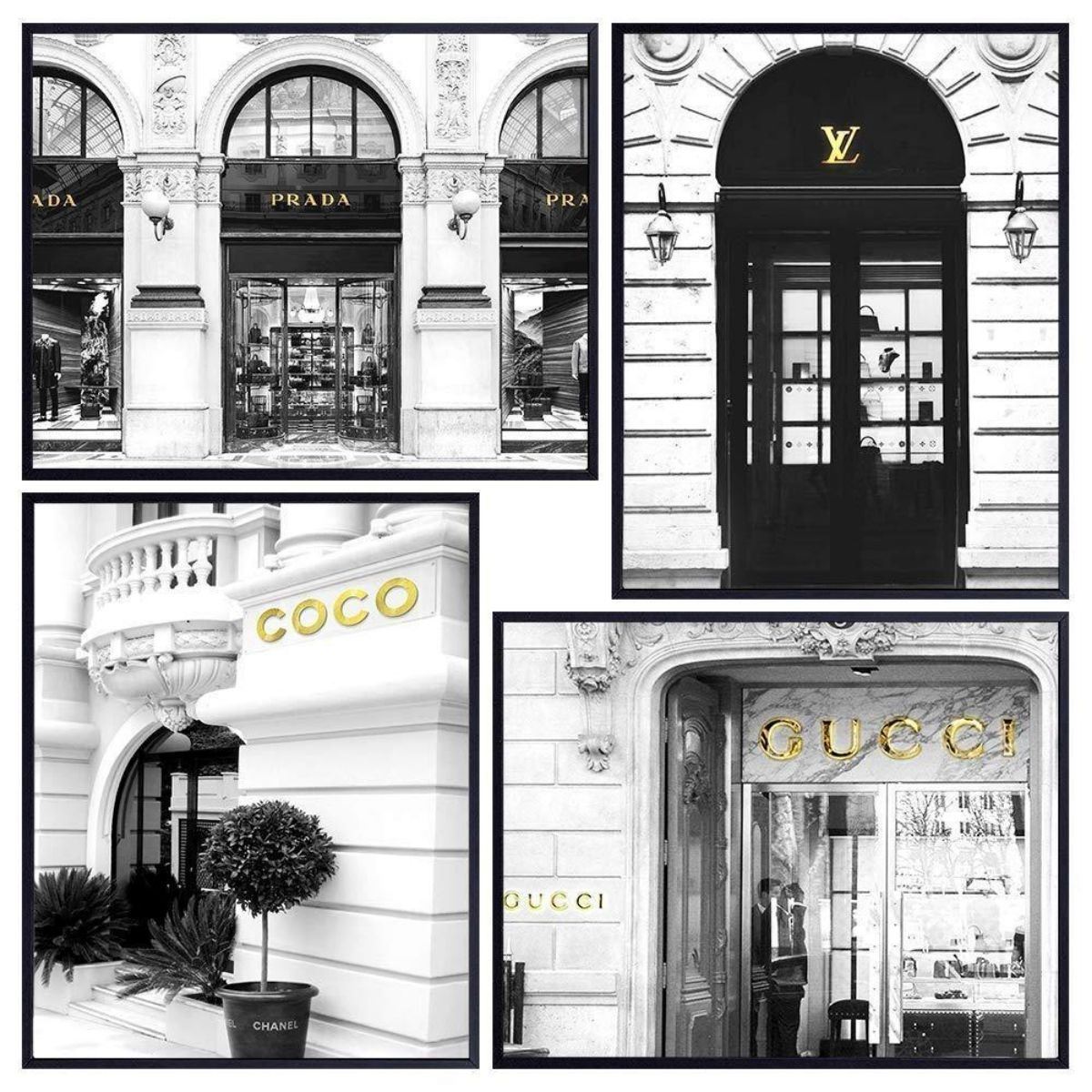 Set of 4 luxury couture storefront photo prints. Set includes Chanel, Vuitton, Prada & Gucci. 8" x 10" each, suitable for framing.Â