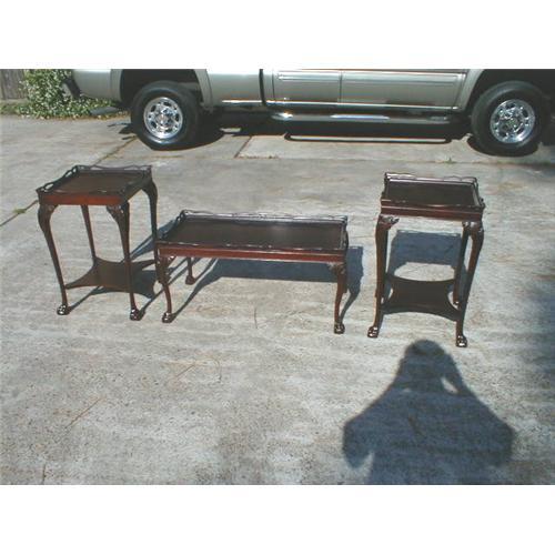 Set of 2 matching End tables and 1 coffee table in attractive Chippendale ball / clawfoot design with carved knees. Made of solid mahogany with ribbon stripe mahogany veneer on the table tops. Each table comes with a glass insert. These tables are in very solid condition. End tables measure 27.5 inches tall by 18.5 wide by 18.5 deep. Coffee table is 17.5 inches tall by 36 inches long and 18.5 inches deep. They were refinished about 5 years ago...and have been recently cleaned and given a fresh coat of finish. These were originally made by the Mersman Company about 1945-1950 but no longer have the manufacturers label. These are quality tables ready for your home.