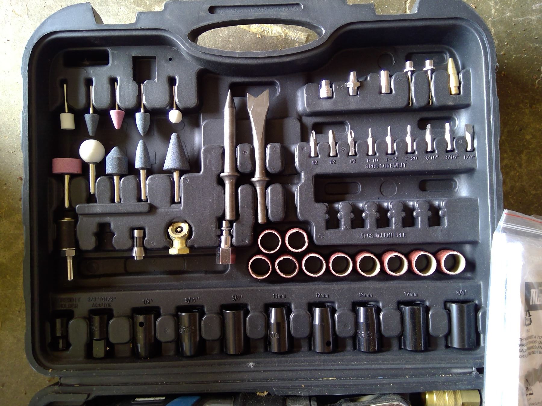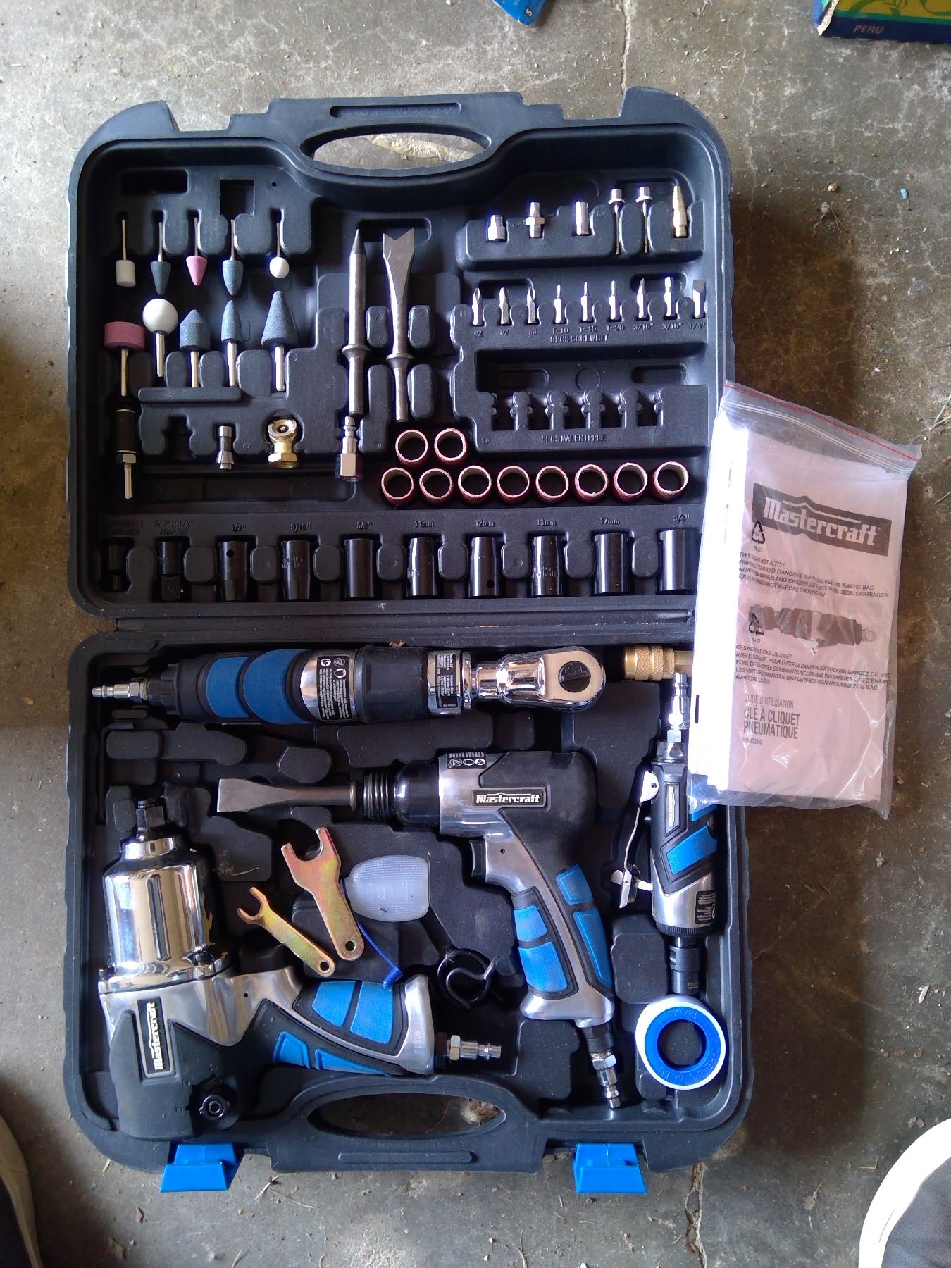 Set of Mastercraft Air-Powered Tools - Impact Wrench, Hammer/Chisel, Full-Size Die Grinder, and Ratchet