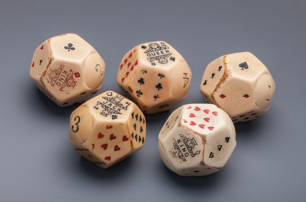 Set of "Montana" Dice. California / Montana Celluloid Poker Dice – Complete set of five dice numbered 1-5; each die can produce ten possible outcomes. Scarce.