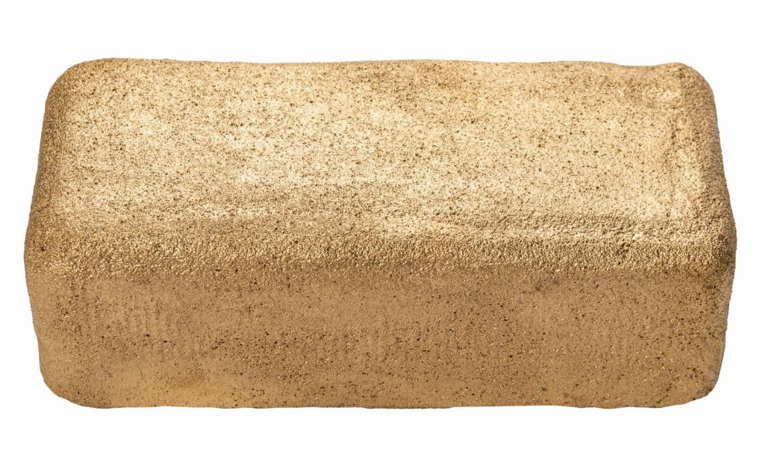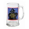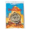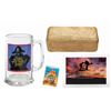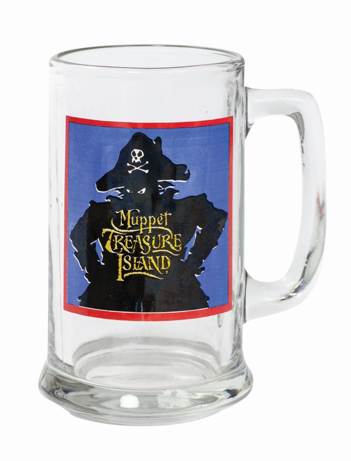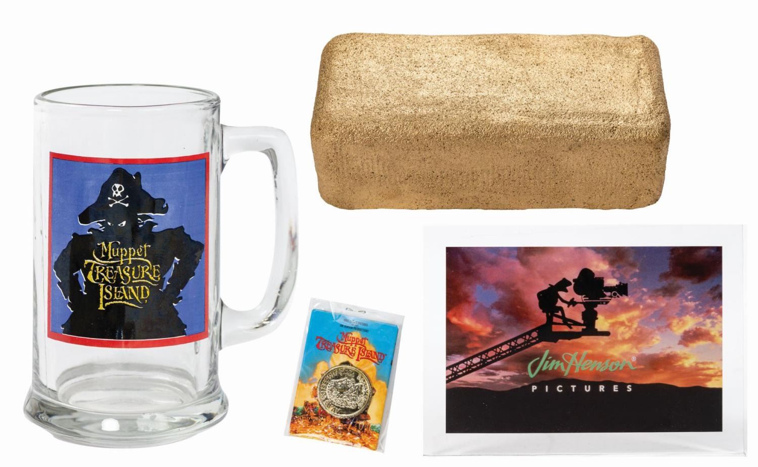 (Disney, 1996) A set of crew gifts and memorabilia from Muppet Treasure Island. The collection includes a glass mug, a rectangular pinback button, a metallic gold plastic prop coin with the legend "Avag Co Bespic" (these coins are cursed), a metallic gold-painted styrofoam prop gold bar, and a rectangular lucite paperweight. Ranging in size from 1.25" in diameter to 5.75"x4.25" and 3.5" deep, the items are in generally very good condition with some light scratching to the paperweight and surface wear to the mug.