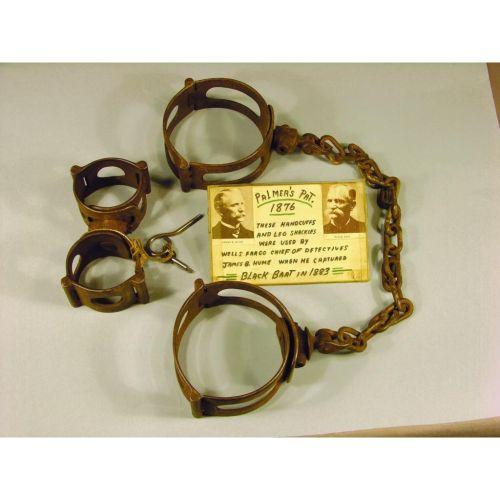 Set of Palmers patent 1876 Handcuffs and Leg Shackles, used by Wells Fargo Chief of Detectives James B. Hume in the capture of Black Bart 1883, comes with keys. Good condition.