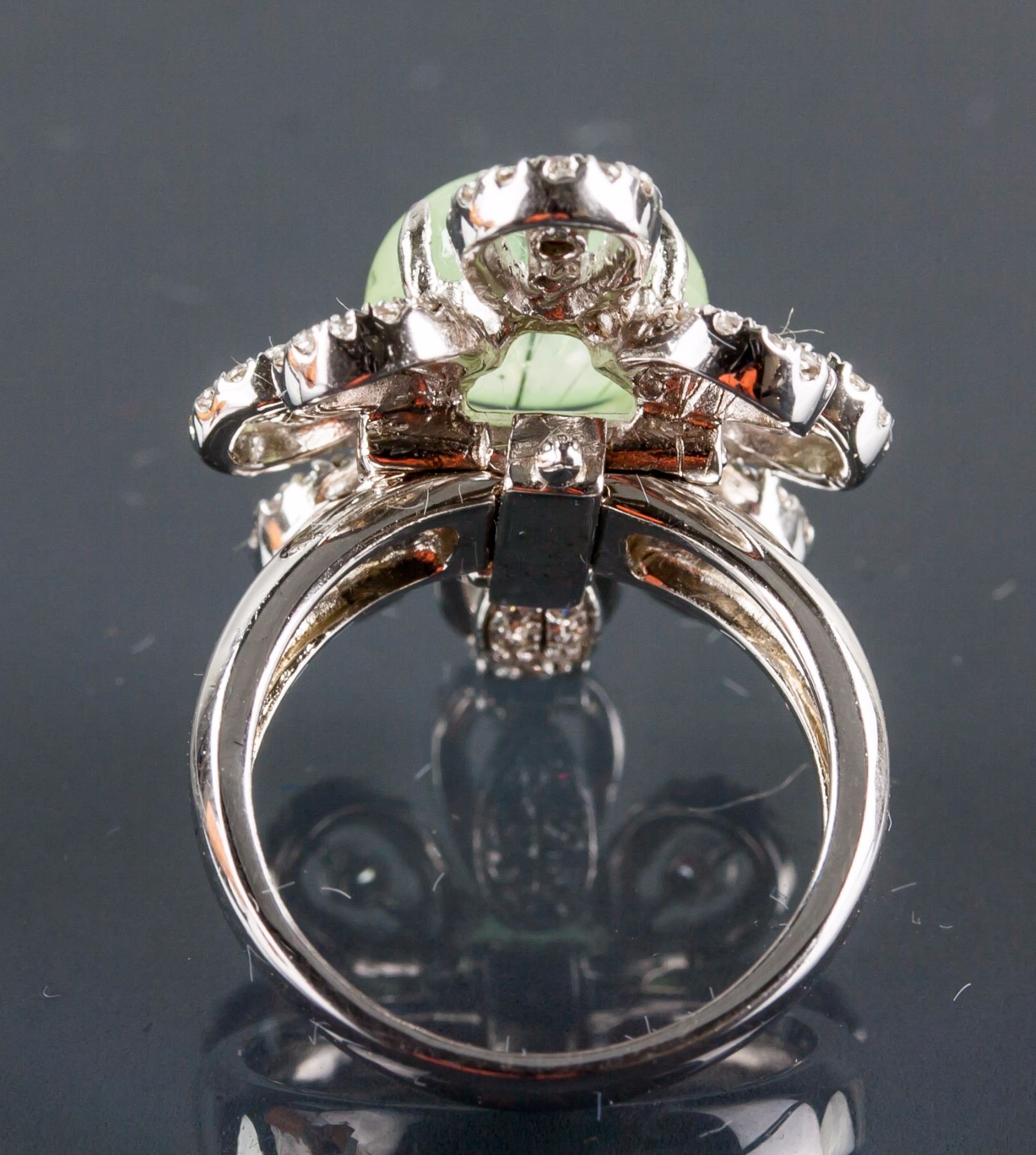 Sterling silver ring; set with one 2.52ct round shaped cabochon light-green parsiolite with 122 round brilliant cut 1.02ct white cubic zirconia; certified replacement value $750; 8.0 grams