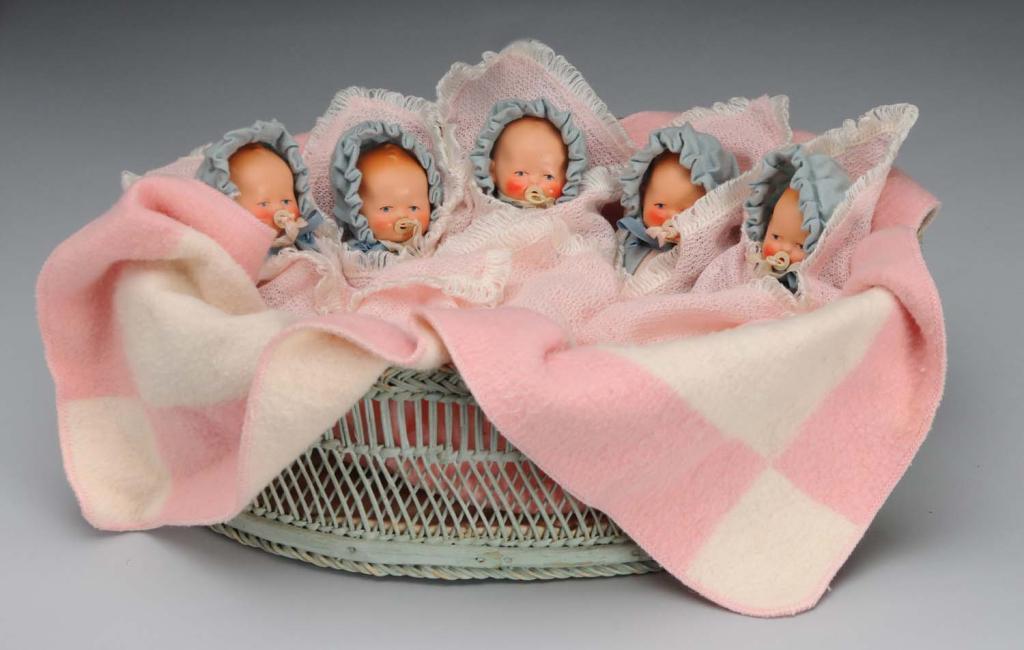 German, circa 1930s. Five painted bisque babies with molded hair, painted eyes, open mouth and pacifier. Wearing white baby gowns, blue capes and each wrapped in a pink blanket. Contained in a vintage wicker basket with pink and white blanket. Condition (Excellent). Size 6".