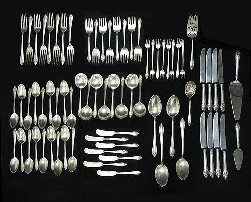 "Set of Reed & Barton sterling silver flatware ""Fragrance"" (1941) initialed B including eight dinner knives; eight dinner forks; eight salad forks; seventeen teaspoons; eight cream soup spoons; one meat fork; one sugar shell; eight cocktail forks; seven butter spreaders; four serving spoons; one cake server; and one cheese server; seventy-two pieces total (no visible defects)"