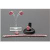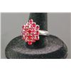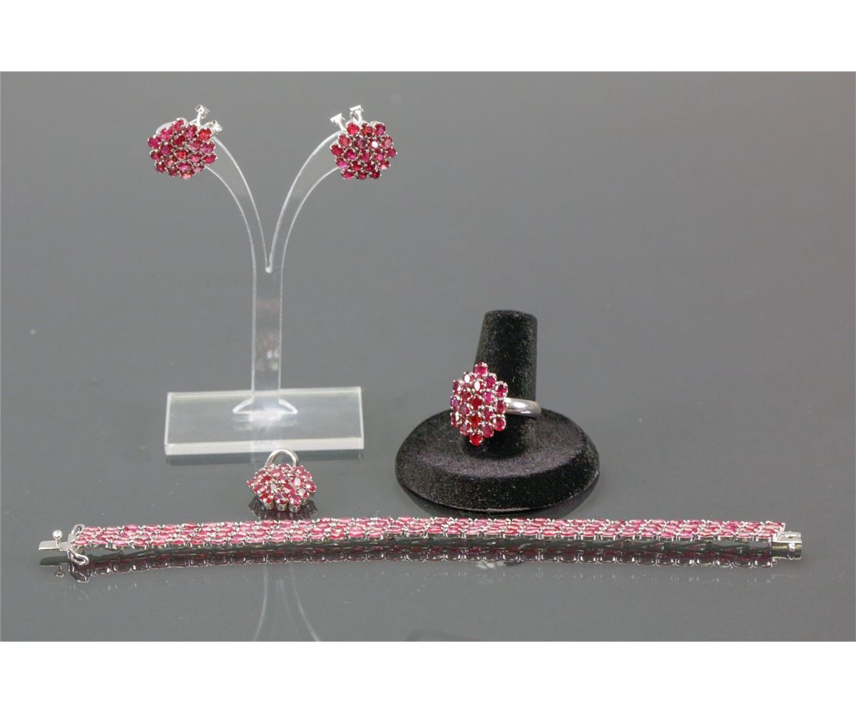 Set of ruby bracelet, ring, pendant and earrings; of cluster style; comprised of numerous round shape rubies; Ring size: 7.5, 25 grams total