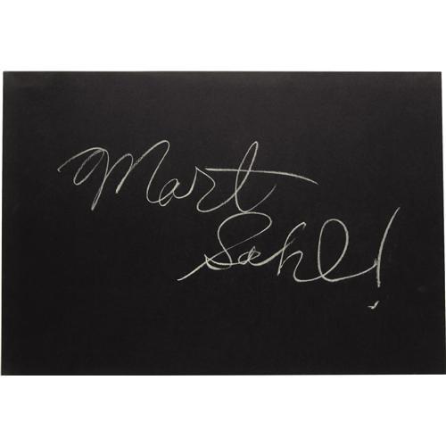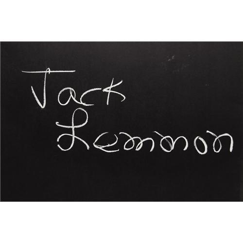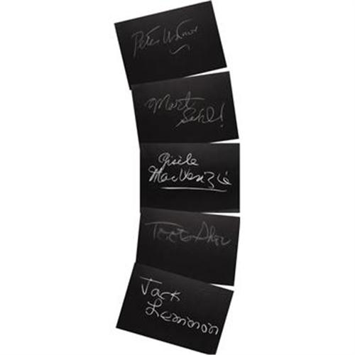 <B>Set of Seven "What's My Line?" Guest Cards Signed by Jack Lemmon and Others.</B></I> Set of seven 26" x 18" black cards from the show signed in white chalk by Jack Lemmon, Peter Ustinov, Mort Sahl, Toots Shor, and Gisele MacKenzie, plus two unknown signatures. In overall Excellent condition with very little smearing. <I>Accompanied by LOA from PSA/DNA.</B></I>