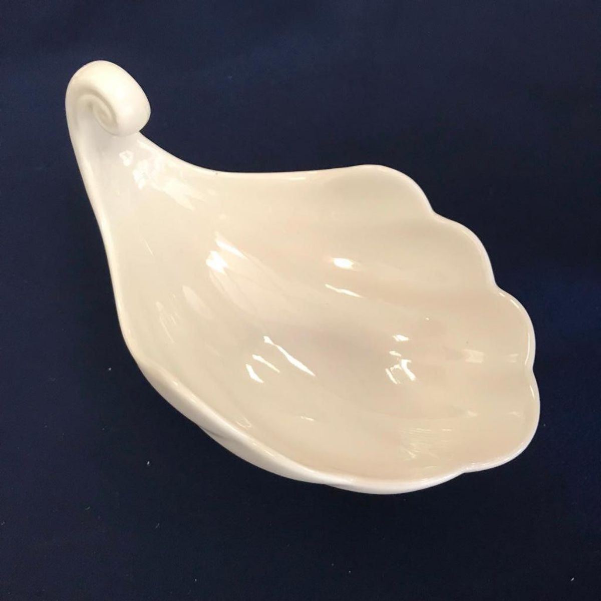 Set of 4 white china shell form servers for nuts or candy. Comes with 4 small matching shell form scoops. 7"L X 4"W X 5"H.