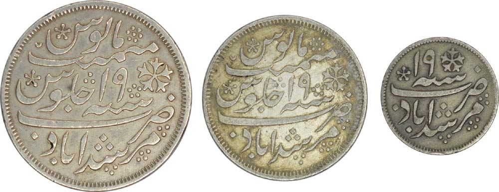 Bengal Presidency, Murshidabad, Silver Rupee (3), 1/4 Rupee, 1/2 Rupee, 1 Rupee, 19 RY, In the name of Shah Alam II, Obv:"saya-e-fazle elah" couplet, Rev: sana julus zarb at bottom,3.10g, 6.30g, 12.45g,16.37mm, 22.91mm, 26.40mm,about very fine.