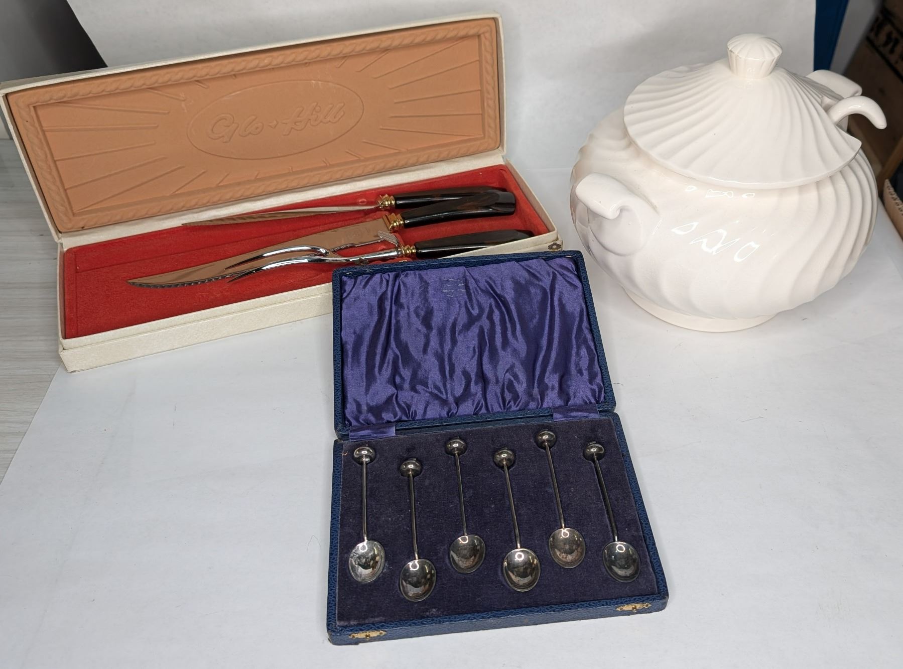 Set of Silverplate Curling Spoons Glo Hill Bakelite Knife Set Soup Tureen Crazing