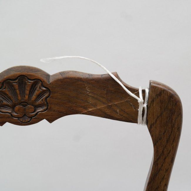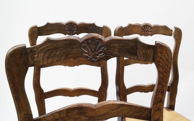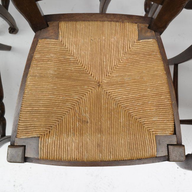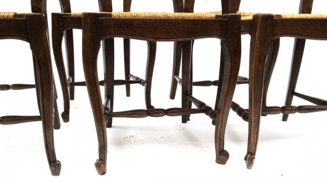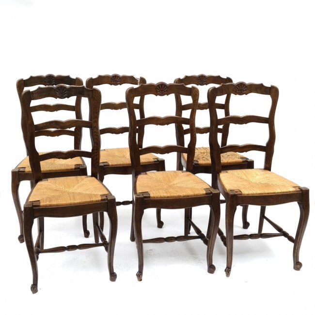 Six country side chairs, all with slip, rush seats. Overall good condition, one with a broken crest. [Back: 16" L x 15" W x 37" H; 18" to seat].