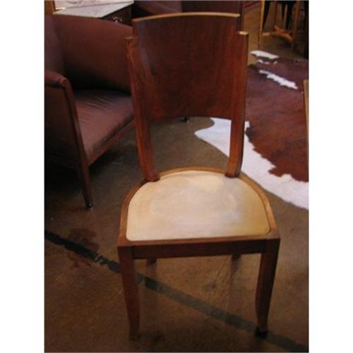 <table width="100%" border="0" cellspacing="0" cellpadding="4"><tr><td><em> </em></td></tr><tr> <td width="100%"> Set of six French art deco period solid walnut dining chairs from Lyon, c. 1930. Gorgeous lines, very unique shape. Original white vinyl on seats. </td></tr><tr> <td> </td></tr><tr> <td>Reference #: BB2258a</td></tr><tr><td>Condition:very good</td></tr><tr><td>Year:1930</td></tr><tr><td>Country:France</td></tr><tr><td>Height:38.25</td></tr><tr><td>Depth:18</td></tr><tr><td>Width:18.75</td></tr><tr><td>Title:Set of Six French Art Deco Dining Chairs</td></tr><tr><td>Style:Art Deco</td></tr><tr><td>Materials:solid walnut, original vinyl</td></tr><tr><td>Location:Austin, TX</td></tr></table>