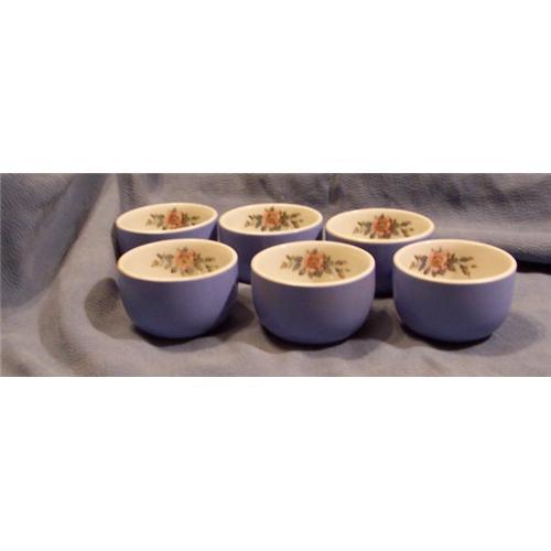 This is the outstanding Rose Parade pattern by Hall Pottery. This set consists of six custard cups. Cadet Blue is the signature exterior color for this pattern. The interior is soft off-white with a pink floral spray on each side. It measures 3 1/2" across by 2 1/4" high. They are in excellent condition with no chips, cracks, or crazing. The btight and shiney finish remains superb. "Hall's Superior Quality Kitchenware - Made in USA - Rose Parade - 1259." is stamped in 24 karat gold on the bottom of each custard cup.