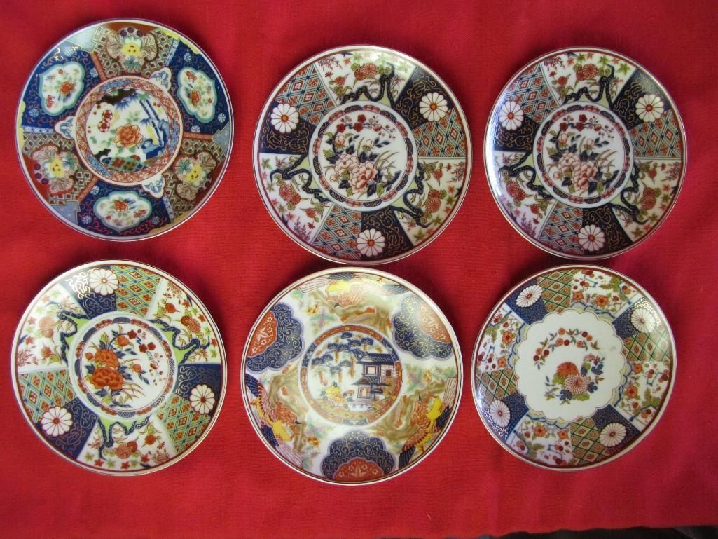 Set of Six ImariStyle Cabinet Plates (Donated byJeri Harkins) This is an ABSOLUTE AUCTION LOT. That means that this lot will be sold, regardless of actual value, with an opening bid of at least $1.00 Mixed set, all Imari or Imari Style 6" diameter Top three Genuine Imari Next two marked identically except for red Japanese characters and word "Imari" Last plate totally unmarked, but of same quality Excellent, highly detailed display