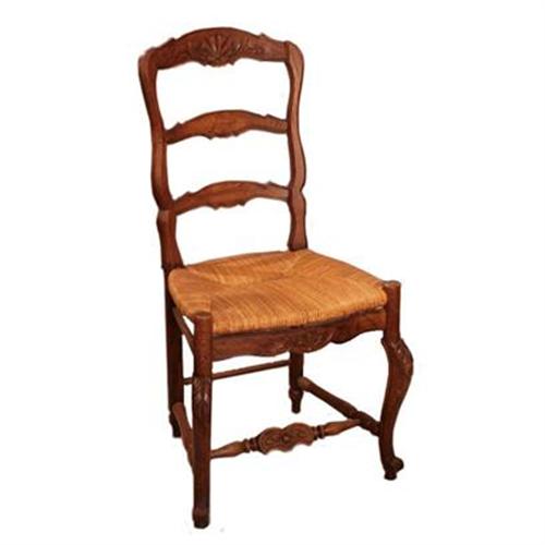 Set of six Louis XV style hand carved oak dining chairs with rush seats.
