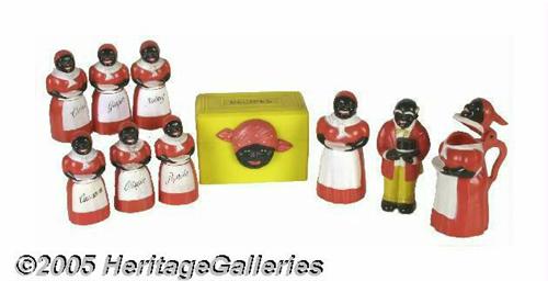 <B>Set of Six Mammy Spice Containers Plus Syrup, Salt and Pepper Containers and Recipe Box</B></I> A unique grouping of Aunt Jemima spice containers and other kitchen ware. Hard to find in good condition and with the extra syrup and salt and pepper pieces. This classic group of Black Americana includes the seldom seen recipe box. Many of the pieces have minor wear, most due to aging of the plastic. The recipe box shows light fading of the lettering, but is otherwise bright and clear. It's not often that a group of this many pieces are available at one time. Lot:250