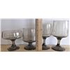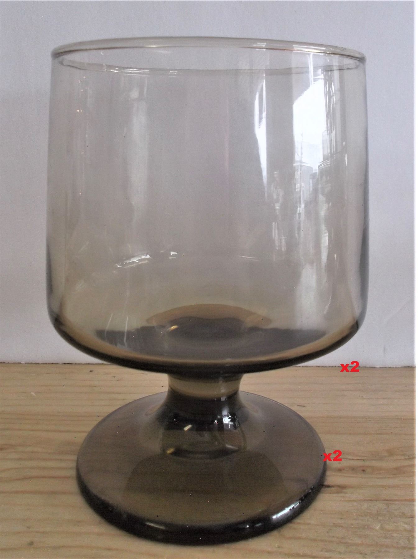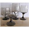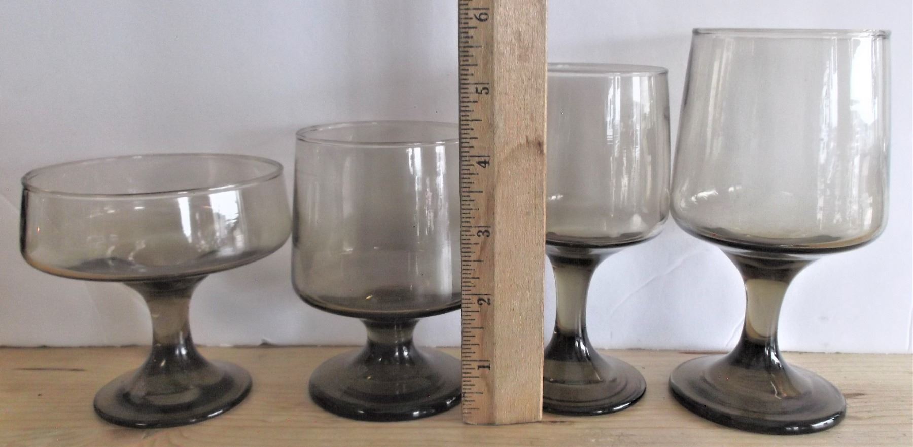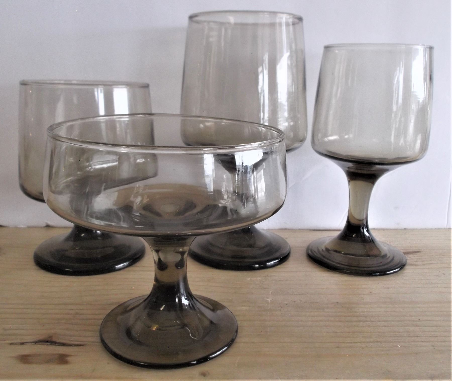 Four small wide mouth glasses, two wider chunky glasses, 12 wine glasses in two sizes.