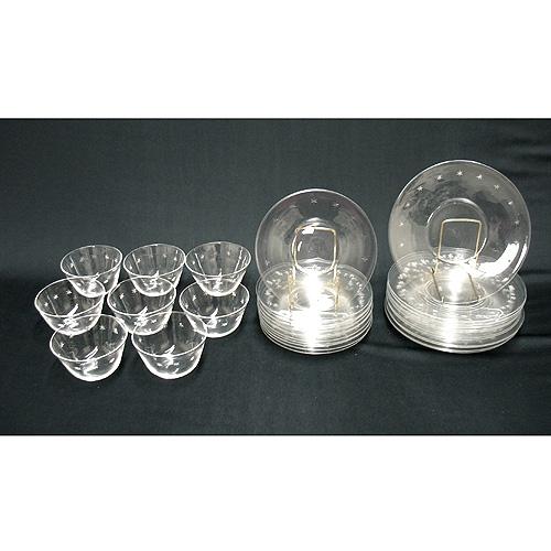 Set of Steuben "Star-Cut" luncheonware including twelve 8 1/2" plates; eight bowls 2 1/2" high x 4 1/2" diameter; and twelve 7" underplates; diamond point etched S on bottom (no visible defects)