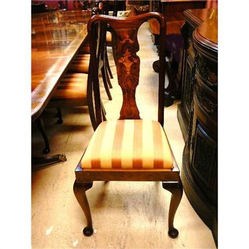This is a fabulous set of ten Queen Ann style inlaid dining chairs. The set consists of eight sides and two arms.