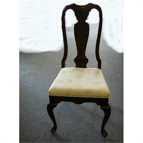 This is a wonderful set of ten Queen Ann Style mahogany dining side chairs. They have some discoloration on the seat fabric bur, otherwise, are in great condition.